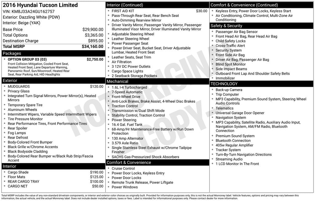 Dazzling White 2016 Hyundai Tucson Limited FWD 7-Speed Automatic 1.6L I4 DGI Turbocharged DOHC 16V ULEV II 175hp