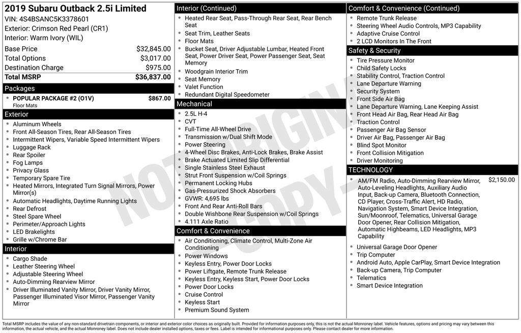 Red 2019 Subaru Outback 2.5i Limited AWD CVT Lineartronic 2.5L 4-Cylinder DOHC 16V