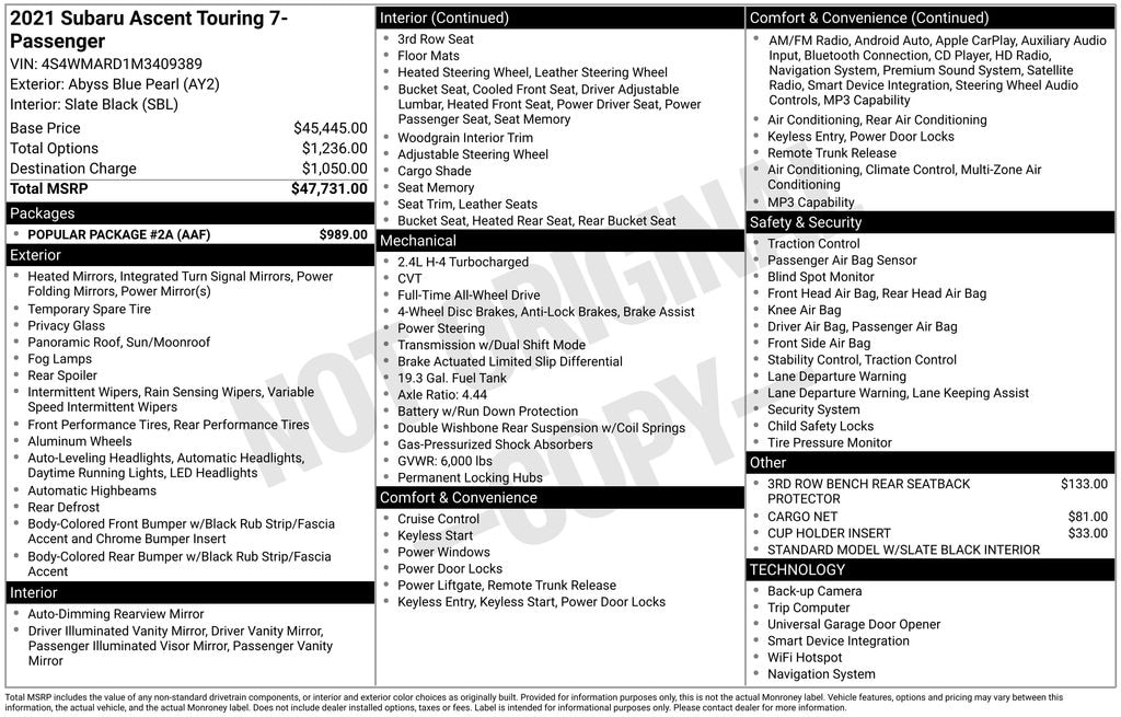 Certified. Abyss Blue Pearl 2021 Subaru Ascent Touring AWD Lineartronic CVT 2.4L 4-Cylinder DOHC 16V